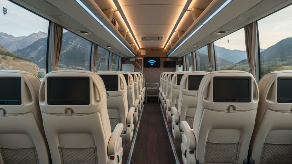 Premium coaches in 2026 are equipped with advanced ADAS systems: lane assist, adaptive cruise control, stability control systems, and blind-spot monitoring. This is particularly important on winter routes and in mountainous regions.